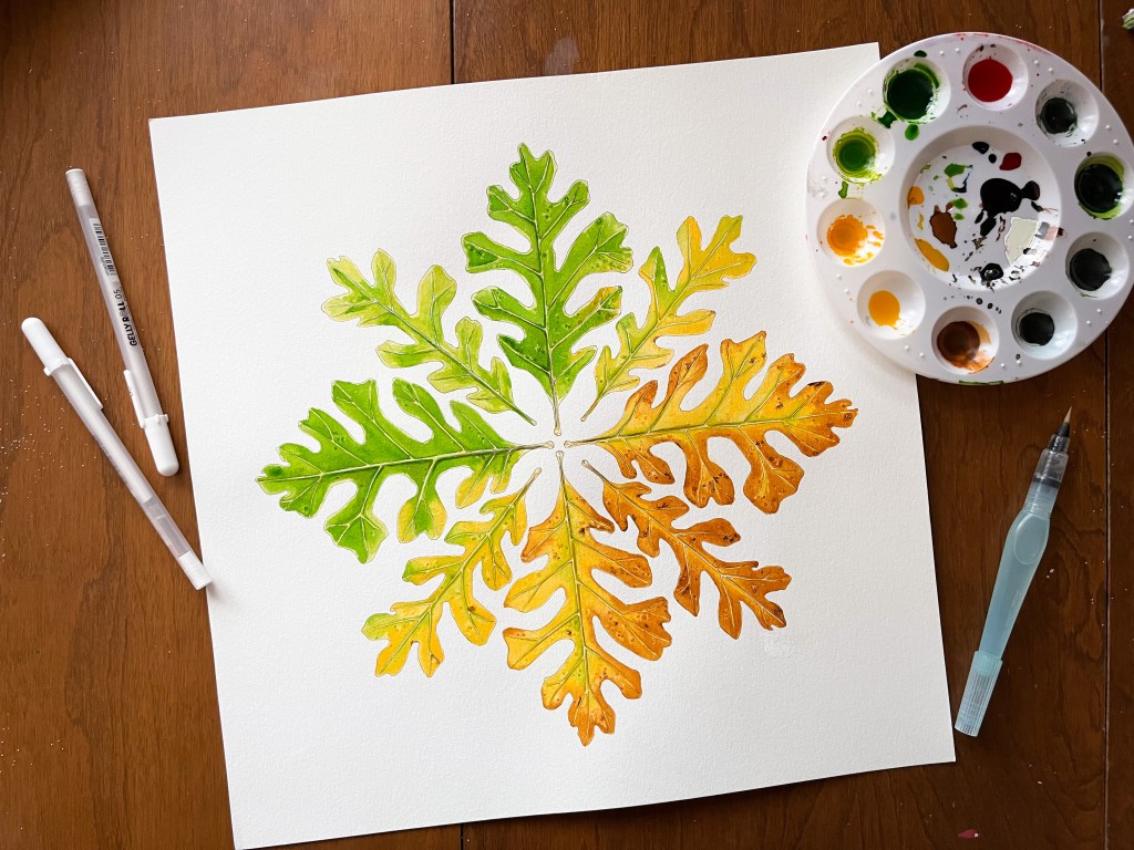 This tree’s ability to age — and all the potential things it has stood witness to — is what inspired me to create this particular composition with the leaves. I wanted imagery that would evoke the passing of time and seasons of life. The leaves are arranged in a circular, semi-circular composition to evoke the feeling of a clock. The colors transform from light green to an orangey-brown, as inspired by the leaves changing in seasons from spring to fall.