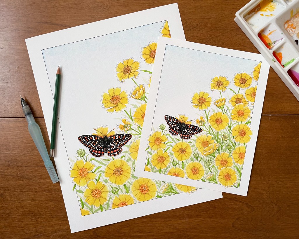Endemic to the San Francisco Bay Area, the bay checkerspot butterfly has a relatively small and specific habitat of only 12,000 acres. This bug relies on native plants that grow in a specific type of soil, including the tidy tip flowers I drew my butterfly with.