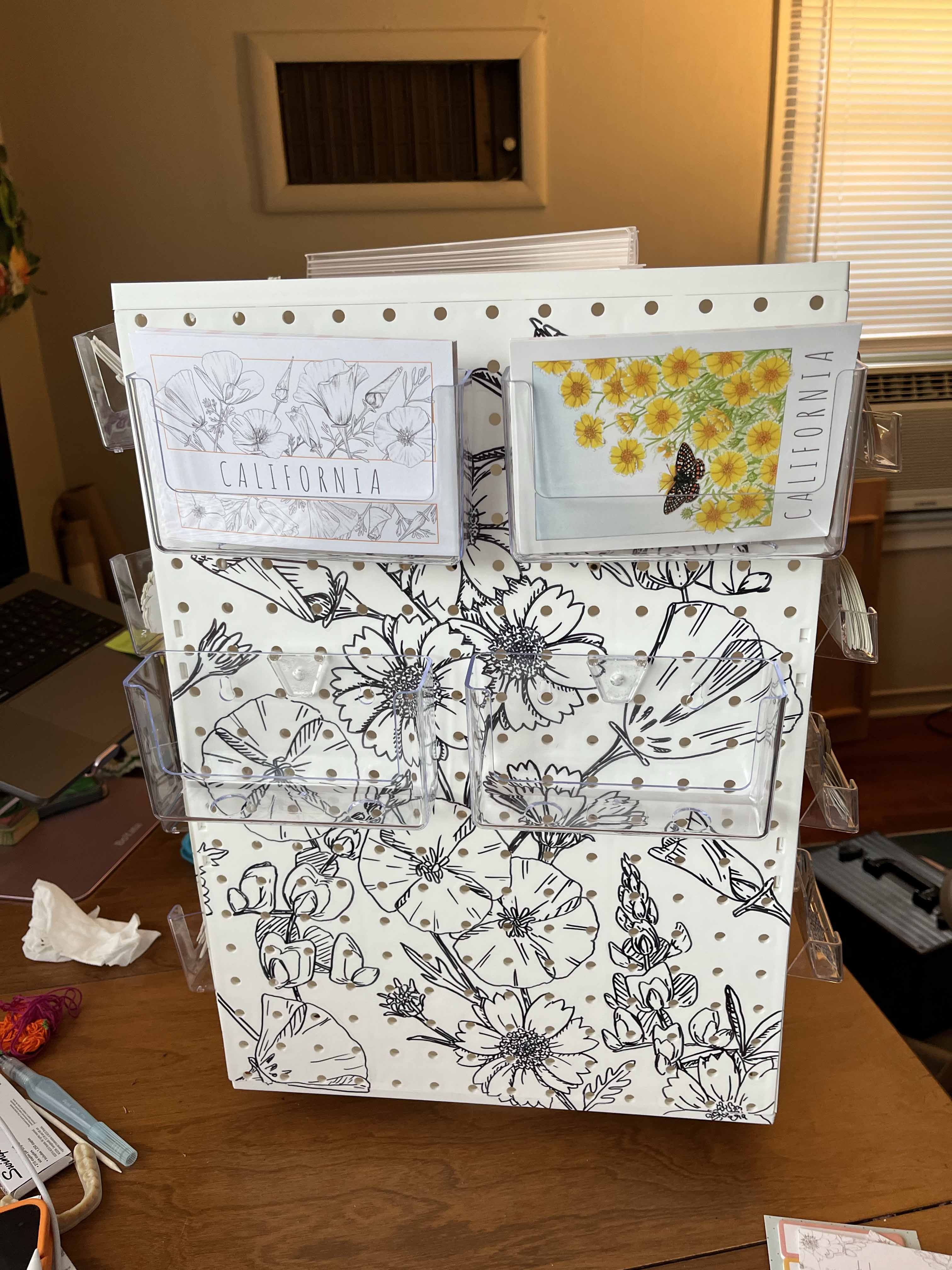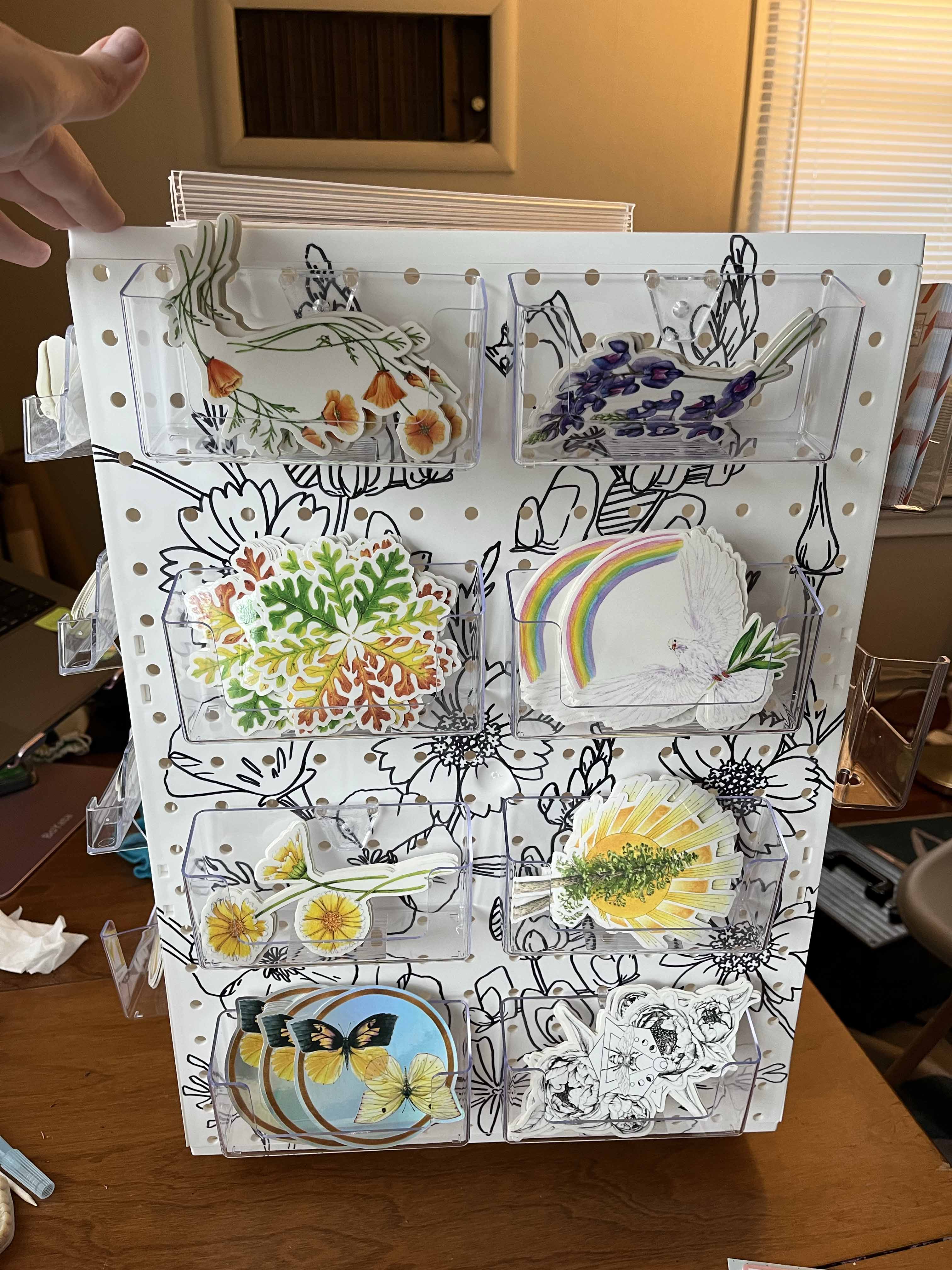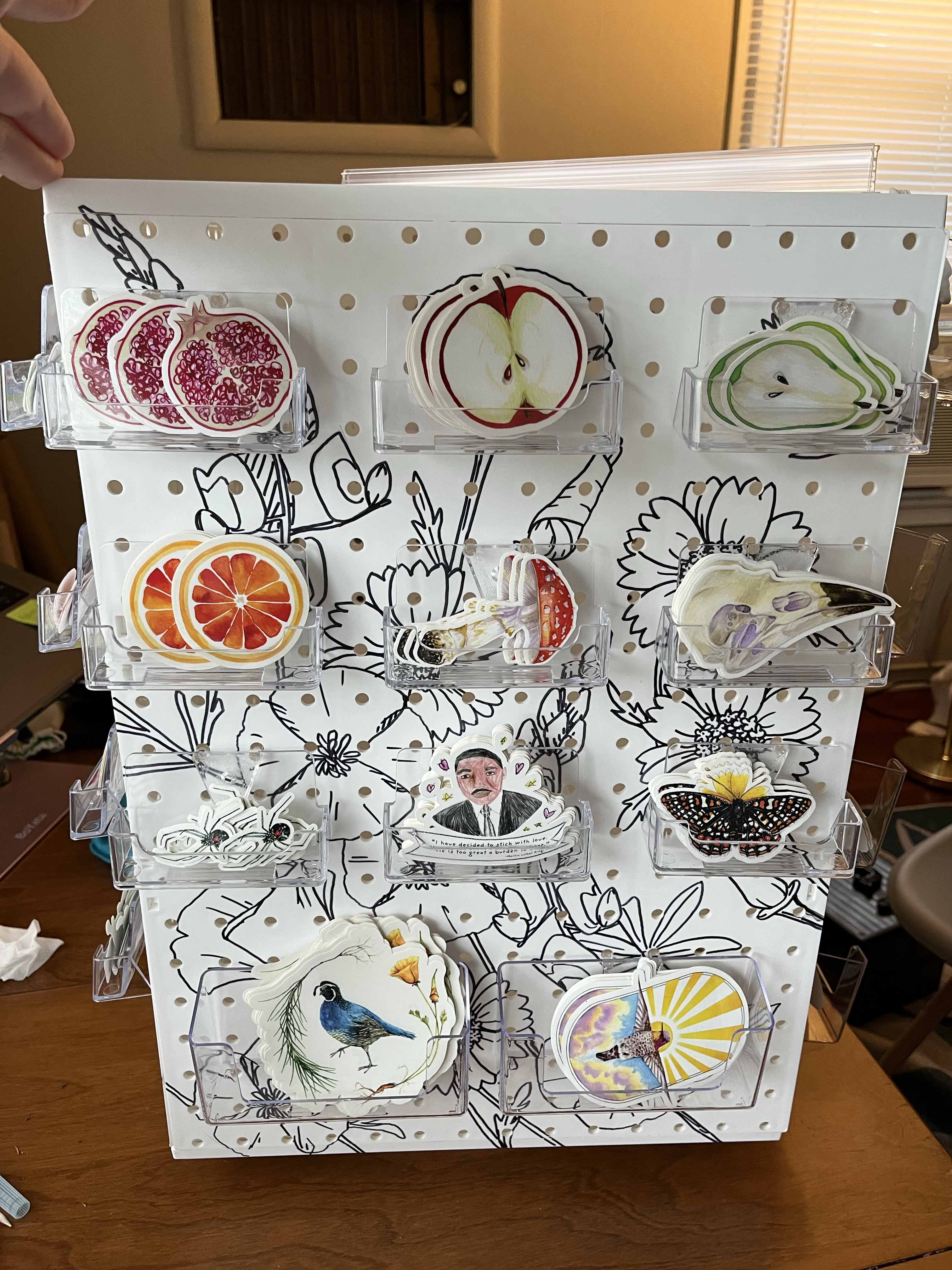 Thankfully, I was able to find someone selling pegboard marketing supplies and I got three different clear acrylic containers for my stickers. I’m also expanding into postcards so those will also find a home on my display!