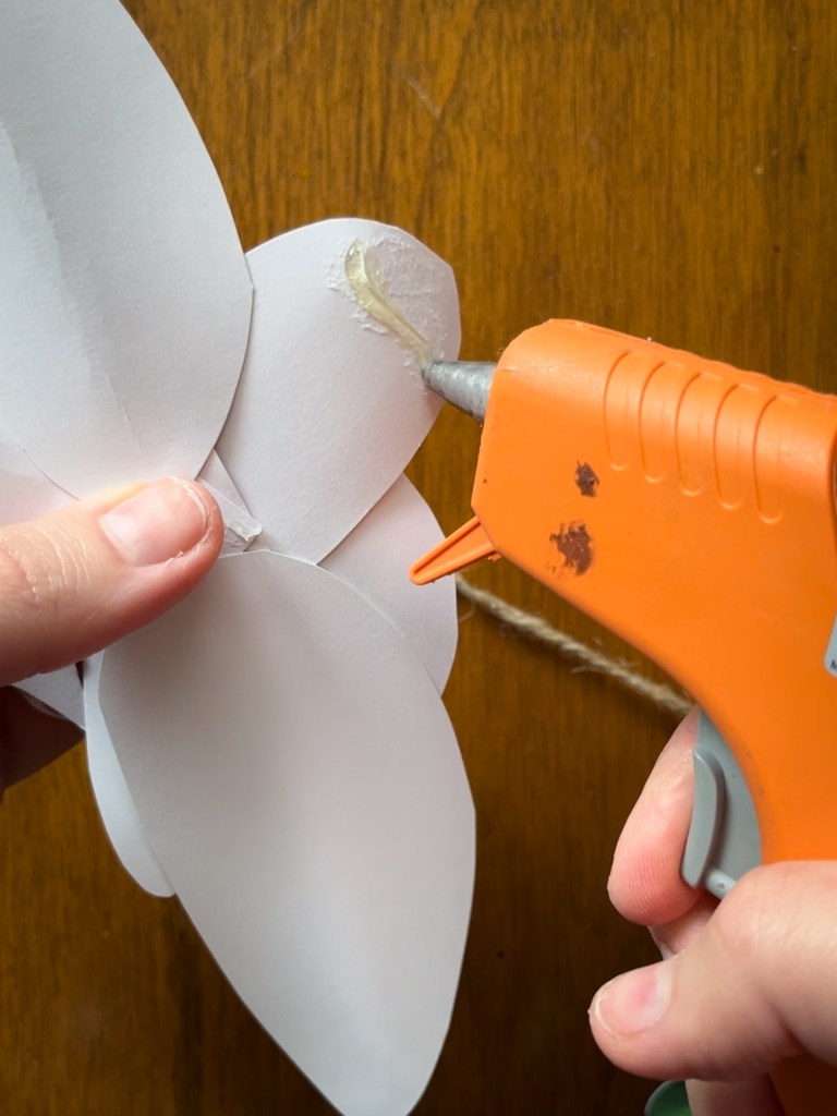 -Add a line of glue to the back of the top petal (shape 5) and secure to twine.